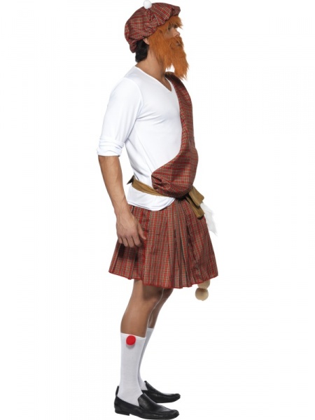 Součástí převleku je klobouček se zrzavým plnovousem, bílý vršek s kostkovaným přehozem, kostkovaná sukně, brašnička kolem pasu, ponožky s bambulkou a samozřejmě dlouhý umělý penis.